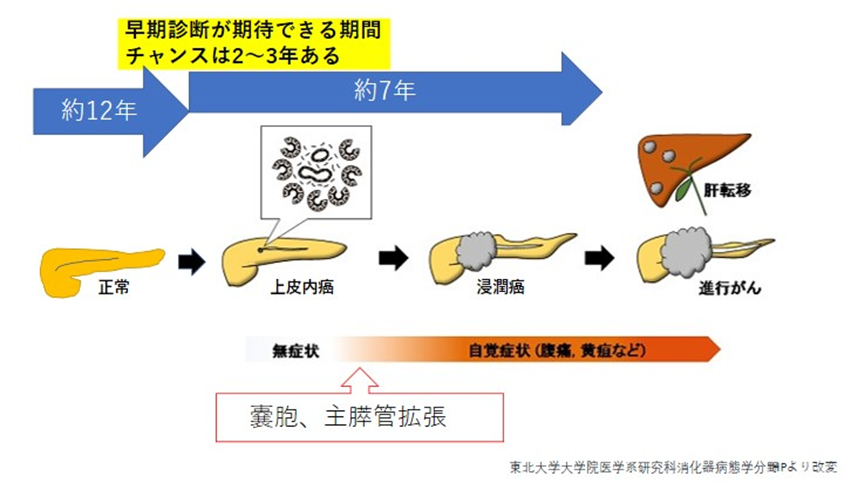 膵癌の始まり0期の上皮内癌の段階は、細胞レベルの変化のため癌自体は画像検査では見えません。癌が増殖して膵管の流れが妨げられると、膵管が一部太くなったり嚢胞が出現し、やがて腫瘍の塊が画像でも見える浸潤癌になります。この期間が2~3年あるのではないかと予測され、膵癌の早期発見に重要な時期と考えられます。