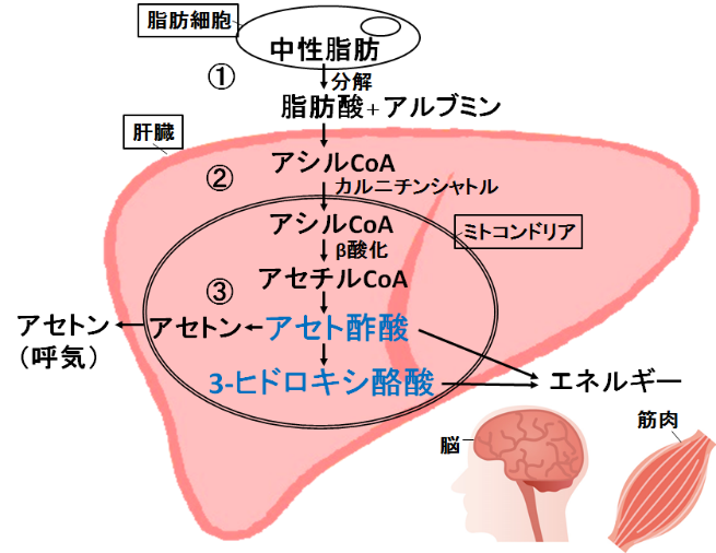 3. アセチルCoAからケトン体であるアセト酢酸、β-ヒドロキシ酪酸が作られ、肝臓から放出されて血流にのり、筋肉や脳のエネルギー源として利用される。